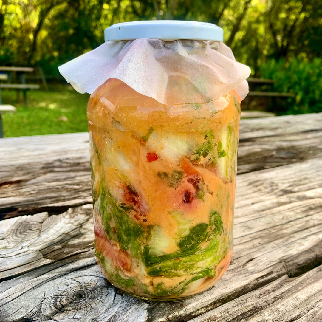 3- Enfrascar en recipientes de vidrio previamente esterilizados; es importante presionar la mezcla en el frasco para sacar la mayor cantidad de aire posible. Limpiar bien la boca de los frascos, doblar una hoja fresca de la mostaza y colocarla sobre la mezcla para crear como un sello entre nuetro kimchi y el exterior. Colocar la tapa dejándola levemente floja para que los gases puedan salir. Dejar fermentar por 3 días a temperatura ambiente.